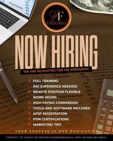 FULL TRAINING (NO EXPERIENCE NEEDED) REMOTE POSITION FLEXIBLE WORK HOURS HIGH PAYING COMMISSION TOOLS AND SOFTWARE INCLUDED AFSP REGISTRATION PTIN CERTIFICATIONS MARKETING TIPS COME JOIN THE WINNING...