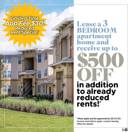 Lease 3 Bedroom Apartment Home and Receive Up to $500 OFF in Addition to Already Reduced Rents!*