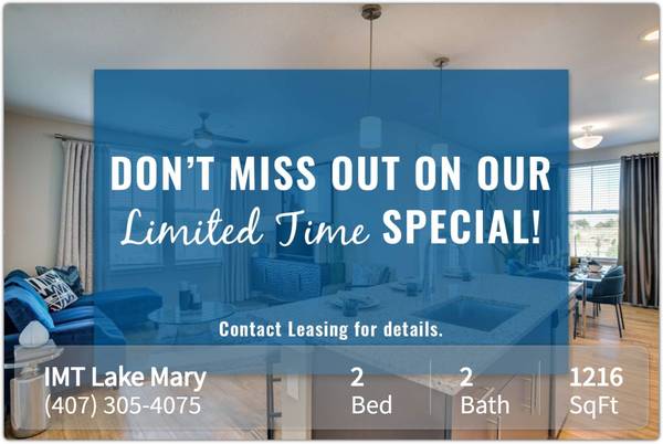About the community: Whether you're looking for a one-, two- or three-bedroom floorplan, every home at IMT Lake Mary comes with the space and amenities you need to thrive. Use the filters and map below to find the perfect floorplan and location for your needs.