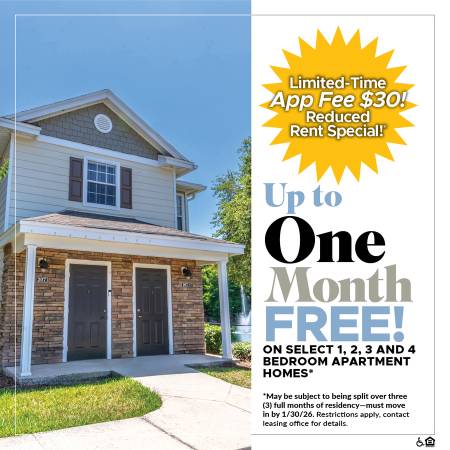 Up to One Month Free on Select 1, 2, 3 and 4 Bedroom Apartment Homes! App Fee only $30!*