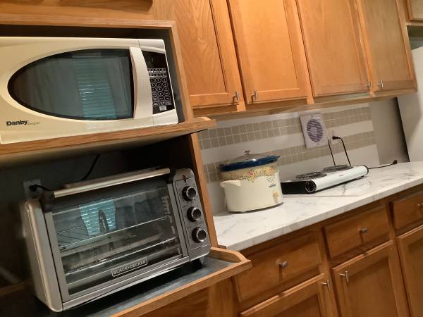 With… Sheets and towels, and dinnerware and pots and pans and coffee maker, and crockpot and toaster oven and everything you could need except food…. Toiletries…. And clothes