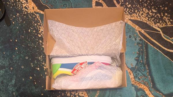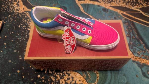 Brand new Vans sneakers, never worn. Colorful design with pink, purple, blue, and yellow panels. Original box and tags included.