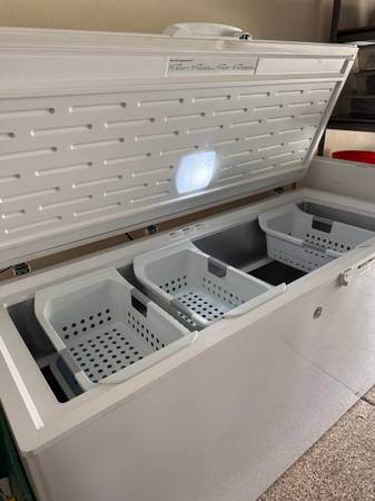Gently used LIKE NEW GE deep freeze . Super Large capacity 65”x28x33 . LED bulb. 5 removeable sliding shelves Capacity 15.7 cu ft Manual defrost Owners Manual