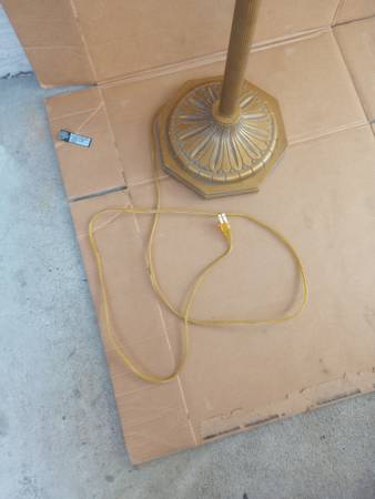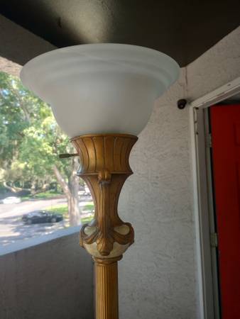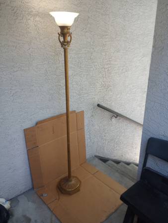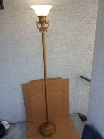 Selling this modern art deco floor lamp, it's in a gold tone and have a vintage looks it stand at 67" high and it's base measures 10" in diameter. Has it's nice original glass shade, ready for a new...
