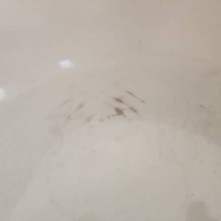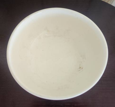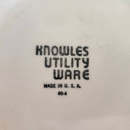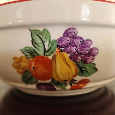 vintage 1940s mixing bowl, ivory glossy ceramic with fruit painted on sides in three places, red band around the rim, made in the United States by Knowles Utility Ware, 9" across, 3 1/2" high, very good condition with no cracks or chips, has some crazing of the glaze inside and some discoloration as pictured