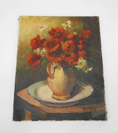 Antique early 20 th. century Belgian oil painting flowers still live signed good To fair condition showing some wear 16 x 13 "