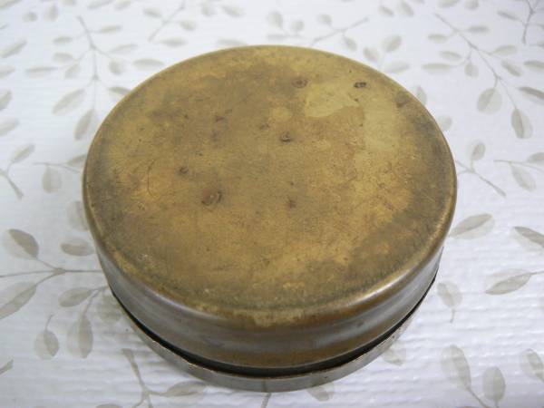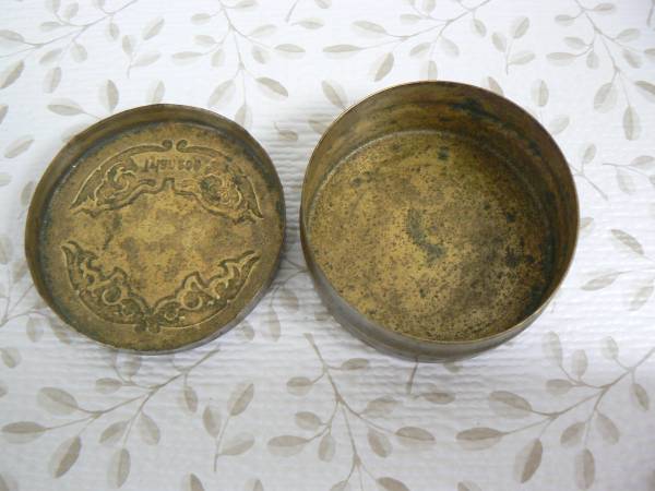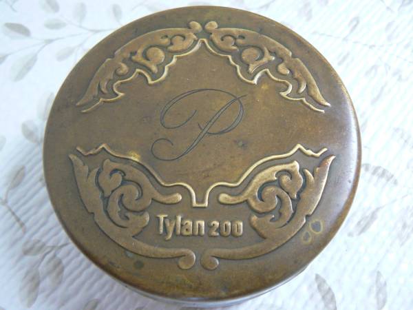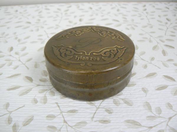 Antique, TYLAN 200 Brass Snuff Box. Size 2-3/4" Across x 1-1/8" Tall. "Tylan 200" printed on the front of the tin. Decorated with attractive scroll design. In very good condition for its age