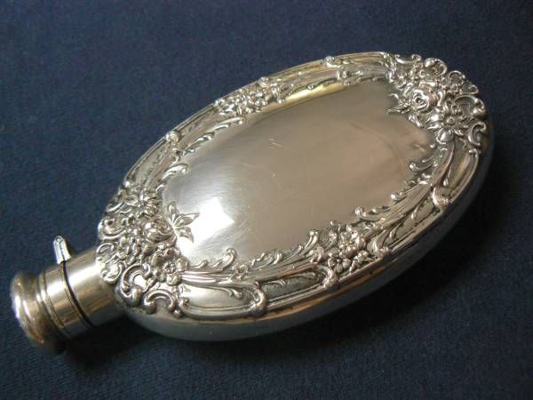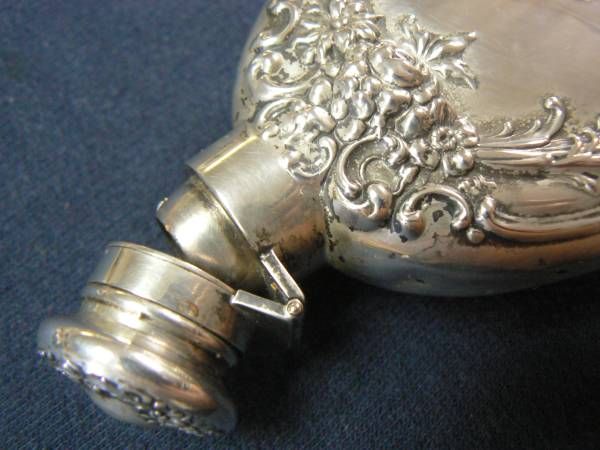 Gorgeous high end, wonderful quality, late 1800's Art Nouveau sterling silver hip flask with classic hand chased repousse floral design in high relief and in very good condition. It is stamped sterling, It is hard to read the hallmarks of the maker, either way it is a good quality company that made this very nice hip flask. It is not monogrammed, so it is ready to be personalized. The hinged top snaps closed on the cork insert and twists to lock. Measures: Height: 5-3/8 in. ---Width: 2-3/4 in. -