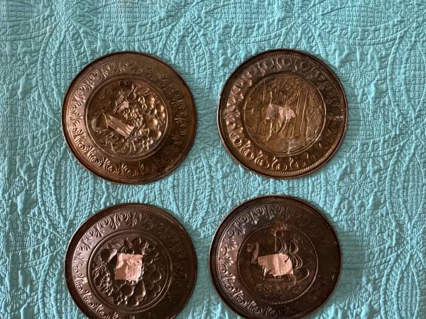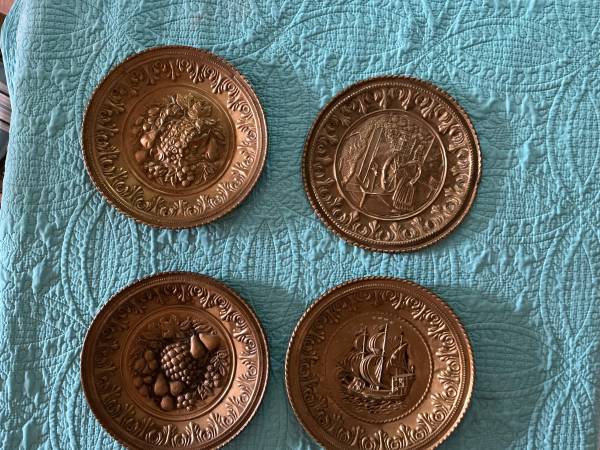 3 Vintage metal (brass?) picture hanging wall plates in various condition.