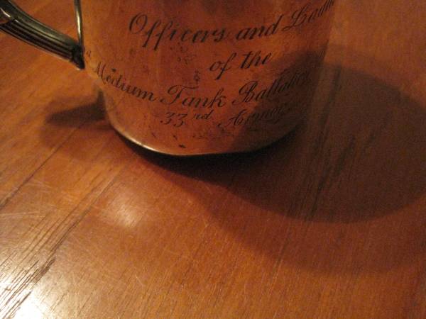 WW2 Officers commemorative sterling silver cup. "The Tiger Battalion", Officers and Ladies of the 2nd medium tank battalion (Patton) 33rd armor. 3.3 ounce sterling silver cup. Early in January, 1942, the 33rd received a number of medium tanks from the disbanded 40th Armored Regiment. The 2nd Battalion of the 33rd saw much action during the Ardennes, the Rhineland and the central Europe campaigns. Trade for vintage American guitar.