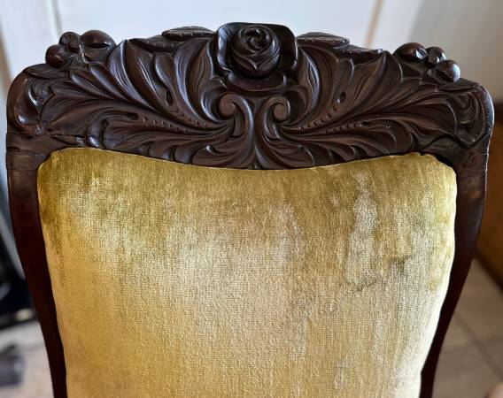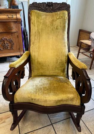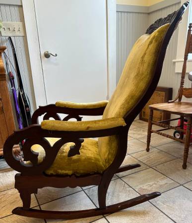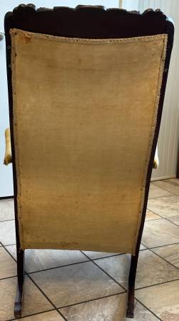 The rocker was purchased at auction at an estate sale at a mansion in Old Saybrook, Connecticut, in 1974. It was re-upholstered in 1974 using the original springs and horsehair. Cotton batting, burlap, muslin, and upholstery fabric were replaced. Also webbing on the back was replaced.