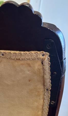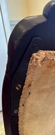 Good condition for its age. Solid mahogany wood frame appears to be very sturdy and good for many more years. Some repairs to wood. See photos of two metal supports in back. Needs new upholstery.