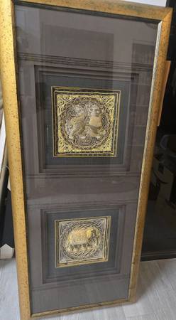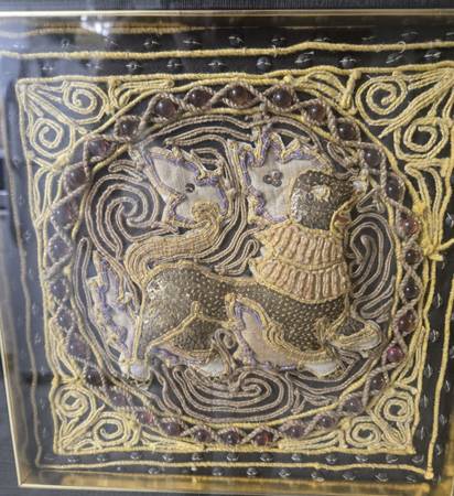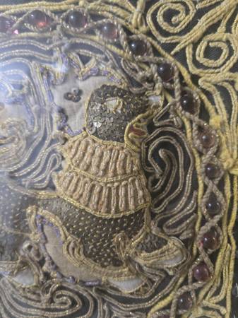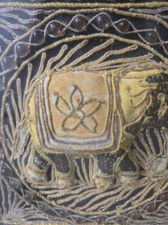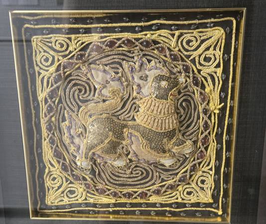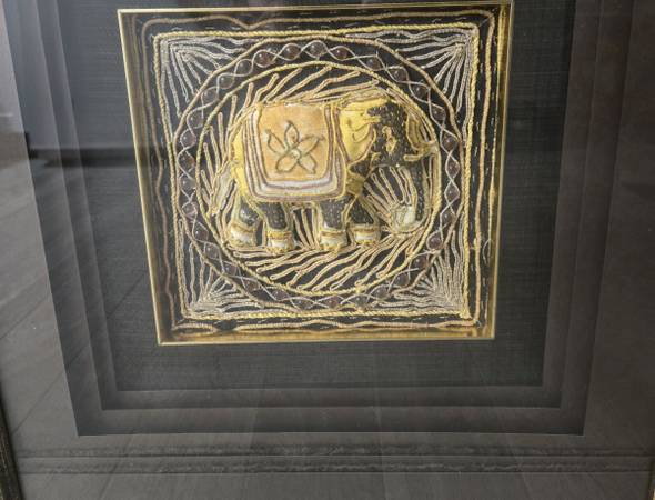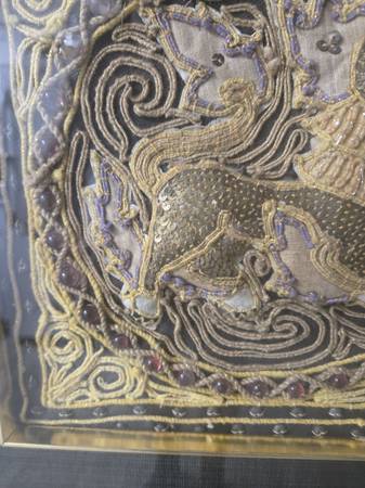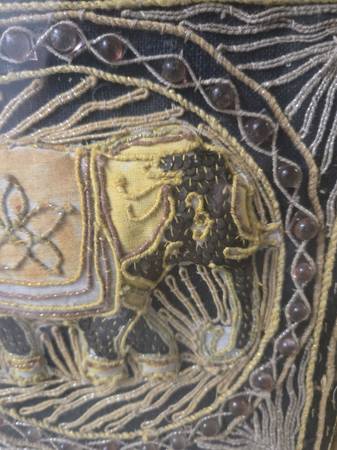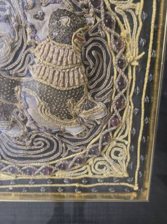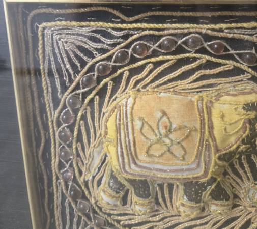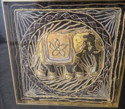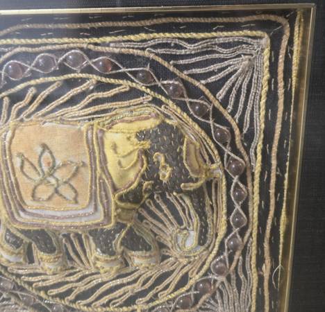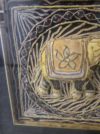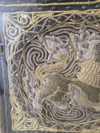 Burmese / Thai Kalaga elephant & lion hand embroidered textile art. Fine materials like silk - sequins - gemmed beads. Amazing technique designs intricate floral motifs mythical lion like considered a guardianin Burmeseculture & elephant . The frame looks amazing with custom matting around the elephant & lion. The frame is 50" tall & 22" wide.