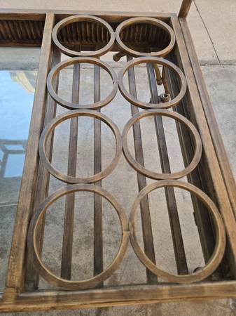 Bar Beverage Cart - metal frame two levels . Top shelf is glass - 22" wide by 19" deep. Bottom glass shelf is 22" wide by 19" deep. On the bottom is a built in bottle holder for either bottles. The cart has wheels for easyedign moving. Has a leaf design around the cart. The cart is 34.5" tall - 30" wide - 20.5" deep.