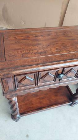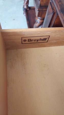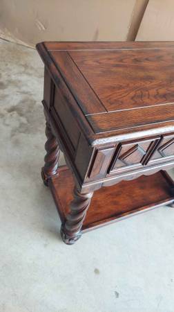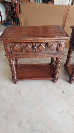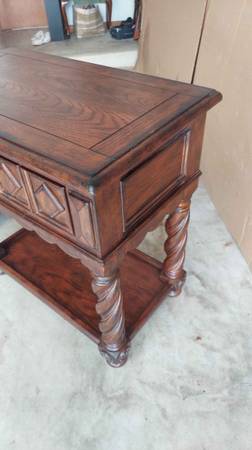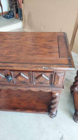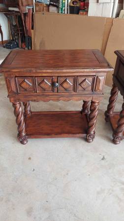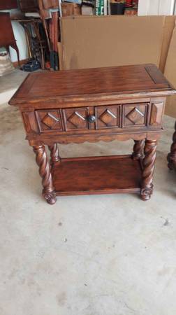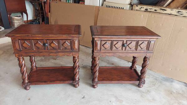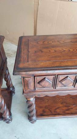 Broyhill nightstands - end tables with one drawer each, one tray style bottom shelf each withan oak appearance. They have a custom design appearance with barley twist columns. The stands are 32" tall so they are great for nightstands or end tables. They are only sold as a pair for $690.00. They are 32" tall - 32" wide - 18" deep. They are in excellent condition for being used.