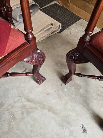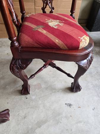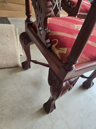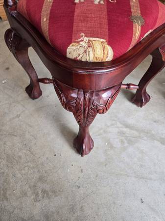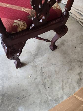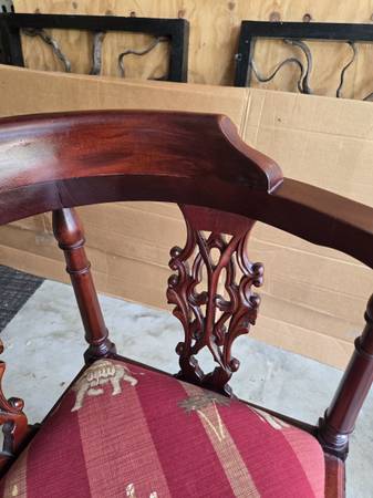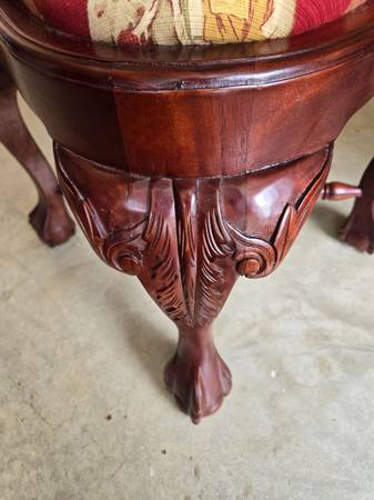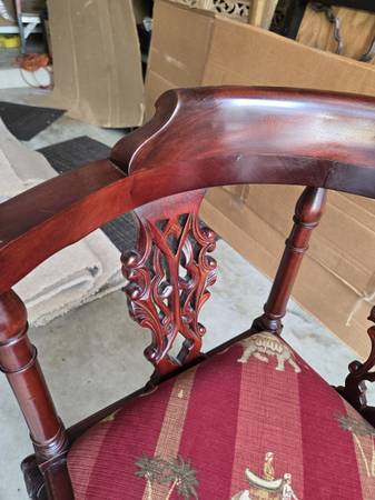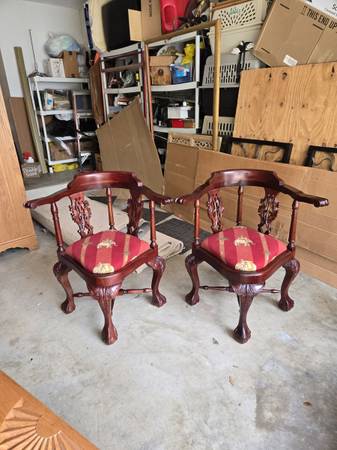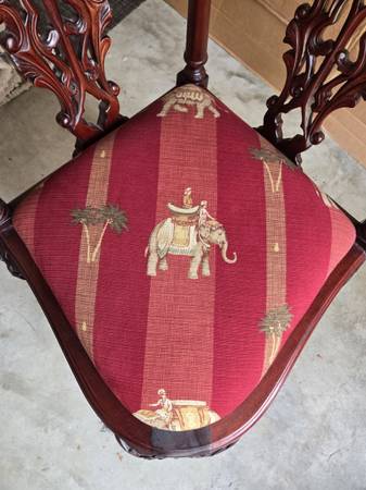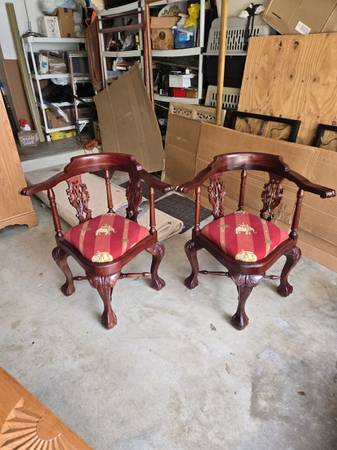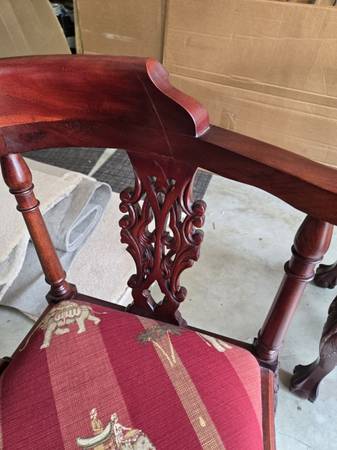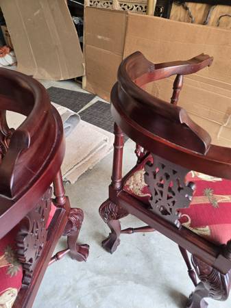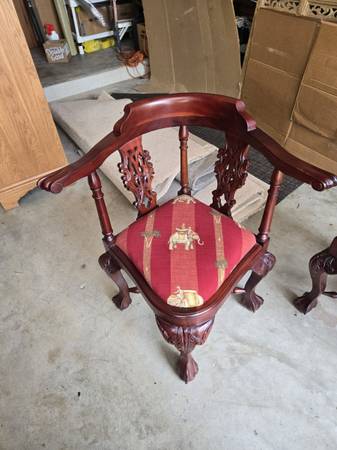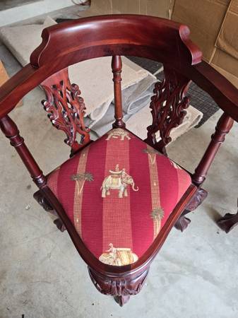 Great-looking mahogany hand-carved corner armchairs. The design looks amazing with four large carved ball & clae w feet. The seat has elephant upholstery. The armchairs are 32.5" tall - seat is 19" by 19" & the seat is 18" from the floor. The armchairs are not old but very well built & sturdy. Some wear as seen in my pictures local only cash only in-person only