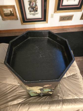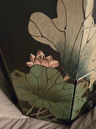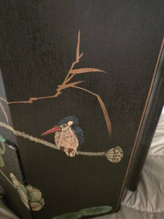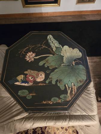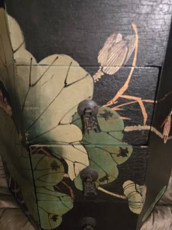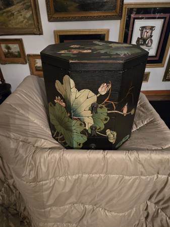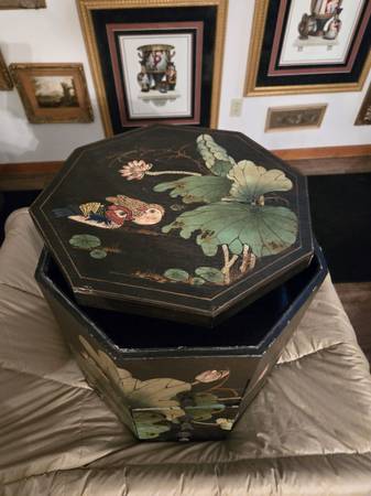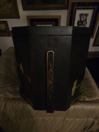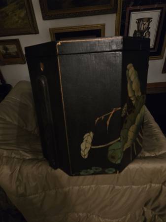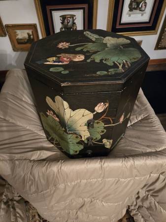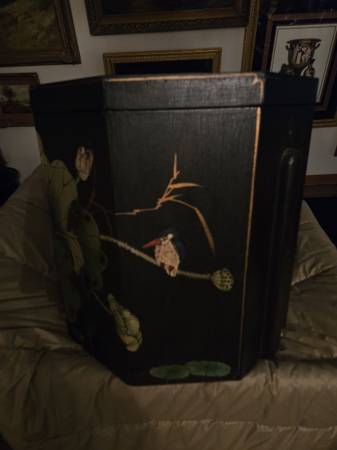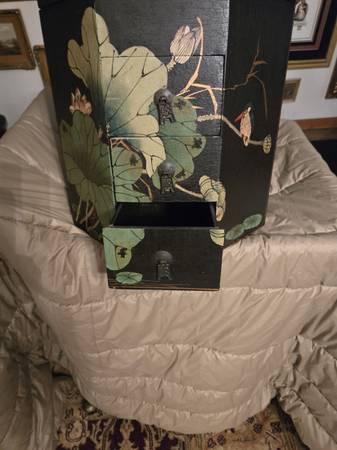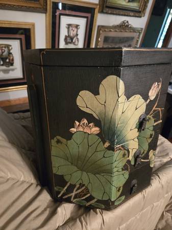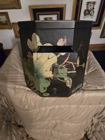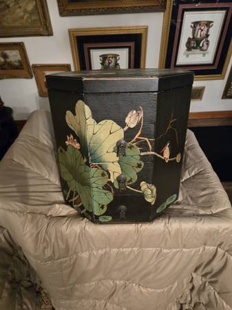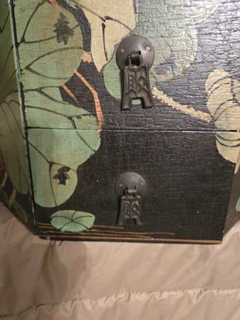 Chinese wedding basket with no handle. Lacquer decorated with birds - lily pads - flowers motifs. Hand painted custom finish . There is no handle for the wedding basket . Three drawers with oriental metal pulls. The top lifts off for storage under the top. From Macau a region of China. It is 16" tall - top is 15" by 15".