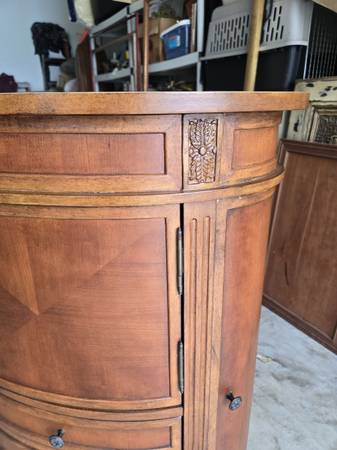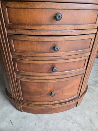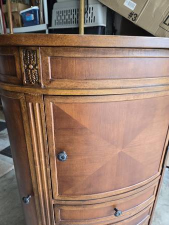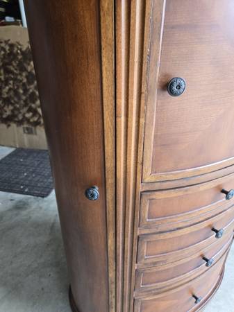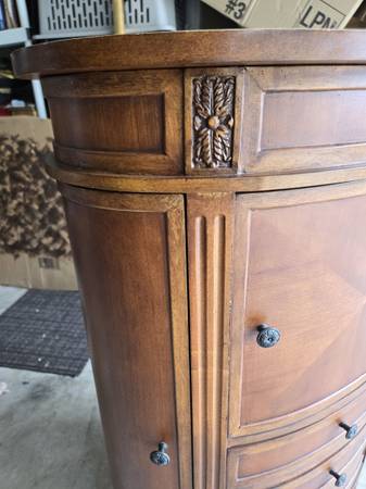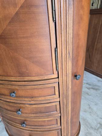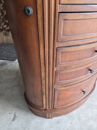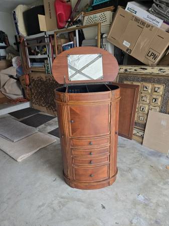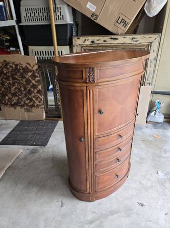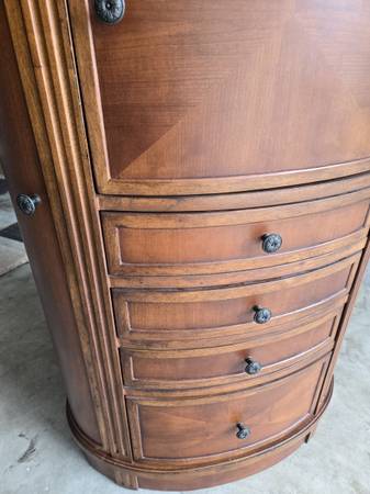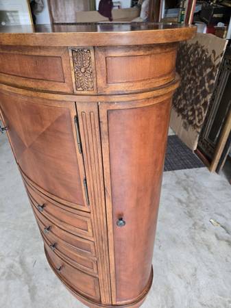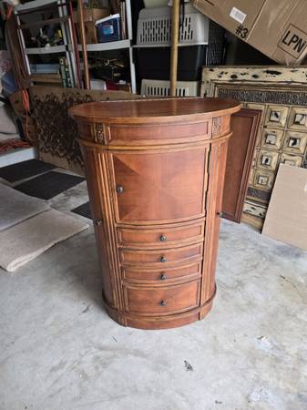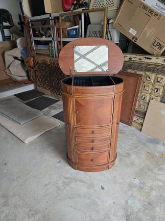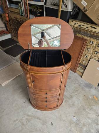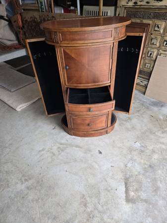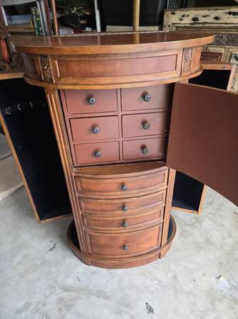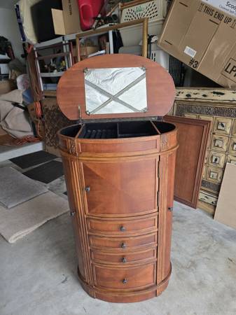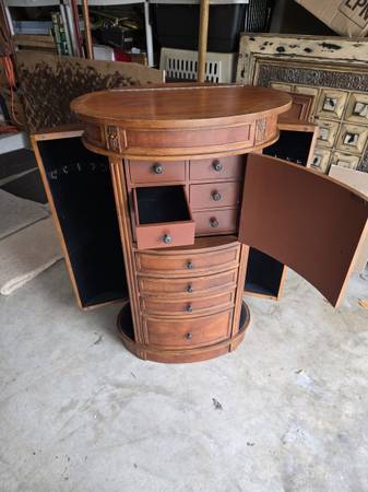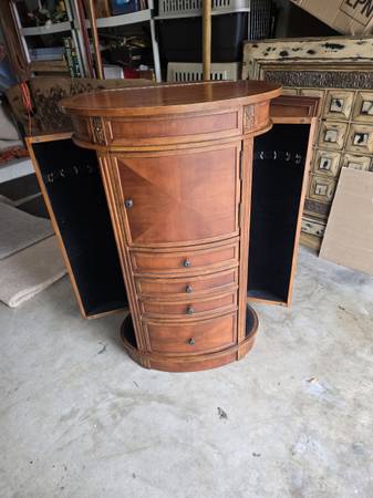 Great looking oval design jewelry cabinet with an elegant appearance. It has two side doors that swing out with five hooks each for necklaces. There is a center door that has six drawers for jewelry. There are four drawers under the center door. The top opens to have several compartments for jewelry plus a mirror. The cabinet is 42.5" tall - 26.5" wide - 17" deep.