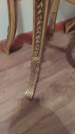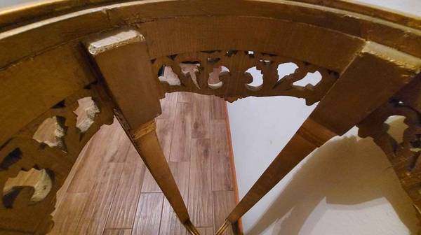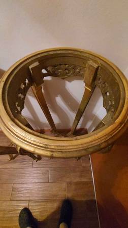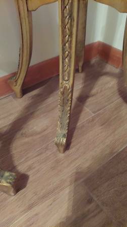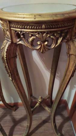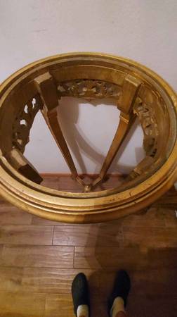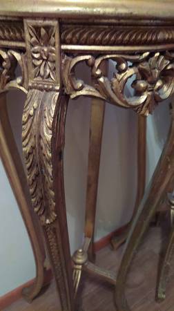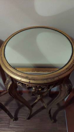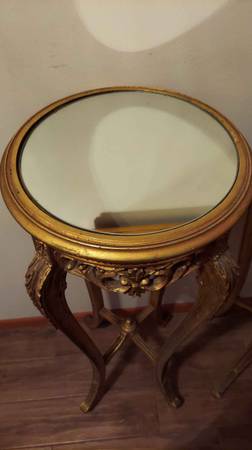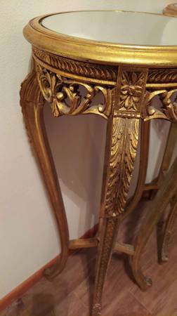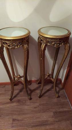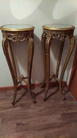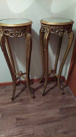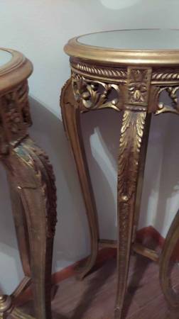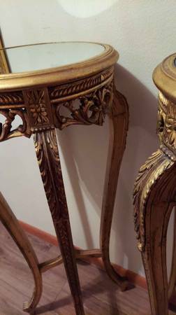 Pair if carved wood goldleaf Vintage pedestals that are 43" tall & the base feet are 14" by 14" . The tops are 13" diameter mirror. The wood top is 16" diameter wide. Some wear on the wood frames & mirror tops as seen in pictures. They are $775 for the pair.