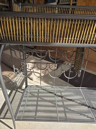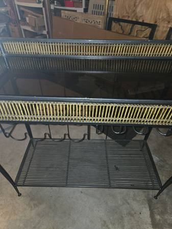 Great looking heavy iron wine or liquid bar. Has an amazing appearance with a wood-tied gallery on top & in the middle of the iron frame. The top is a .25"thick piece of dark glass. There are a few marks on the glass due to its age. Has a bottle holder for eight bottles. There are four wine glass holders for a lot of glasses. A full bottom iron shelf for tons of supplies. There are rubber caps the the feet with one missing. Some wear as seen in my pictures. The bar is 40" tall - 44" wide - 18.5" deep.