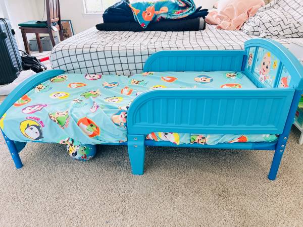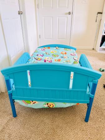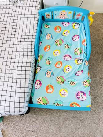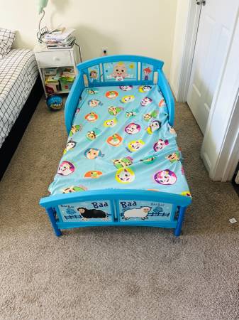 This blue toddler bed features cheerful “Baa Baa” sheep and friendly characters in a colorful, kid-friendly design. It’s the perfect transition bed for toddlers moving out of the crib — low to the ground for safety, with built-in side rails for extra security.