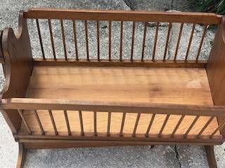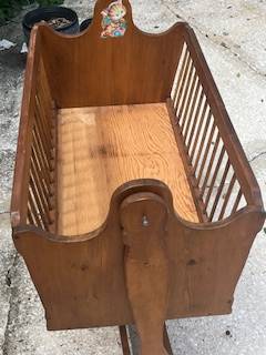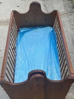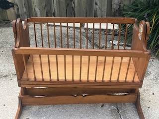 Beautiful hand made wood rocking cradle, with good mattress. All wood, no paint. Made with love for my first child.
