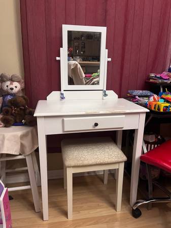 Pink Foot stool, $45 night stand, $80 White 4 drawers dresser, $100 Air mattress, $65 with pump Plank board, $100 2 Luggages, $100 Yellow cube, $60 Hook, $15 Vanity, $120 3 Office mesh chairs, $80...