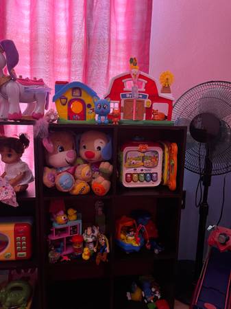 Hi, my kids have outgrown of everything that my Mom bought for them. Selling as a bulk. $800, have more than what’s listed, from infant to toddler, you name it. I have it. Walker, ride on, blocks, playdoh modes, dolls, plush, safety gate, high chairs, doll house, art desk, play kitchen and play food, interactive toys, pretend house/princess shoes, floor mat, books, tethers, Rattles and etc, if you want individual, just ask.