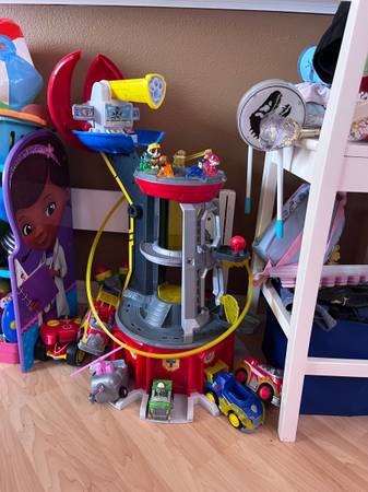 Paw Patrol Sea Patroller Transforming Vehicle Boat, $25, no sound Paw patrol lookout tower, with sound, $50 Whale bath tub, $12 Small Minnie house, $25 add accessories for $20 extra Toys chests, I...