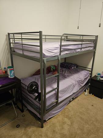 Metal bunk bed with pull out trundle. Sleeps 3. All 3 mattresses included. 1 is a cheap mattress, the other 2 were upgraded. All are in very good condition. Comes from a non-smoking home (also pet-free). Mattress protector and fitted sheets also included.