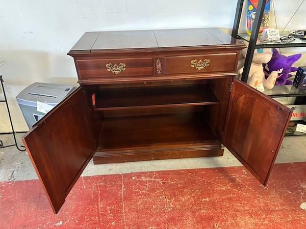 Beautiful antique buffet style table. Both sides fold out and both doors open.