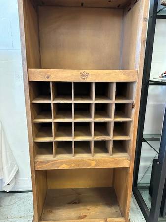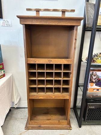 This wine rack holds twenty bottles and has storage for your decanters, wine openers, and glasses. You don't want to miss out on a conversation piece like this!