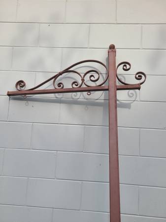 Elegant custom-made scrolled wrought iron sign posts for 18" x 24" hanging signs. Anti-twist extensions for stability. Welded, primed, ready to paint. Qty. 6 available. $50 each.
