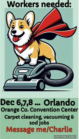 Need workers for the week of December 15 through the 15th or 16th at the Orlando convention international Drive, pay is $15 an hour cash morning hours and evening hours if interested email no...