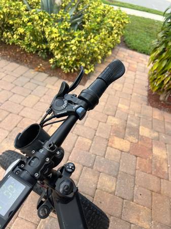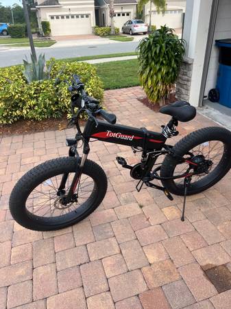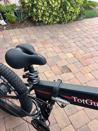 Toteguard FAT TIRE 21 speed electric bike only used six times short distance on streets only. This E bike has been upgraded by a professional bike shop, (300.00 ++)which includes new control panel, including kit to increase speed. 21 speed Shimano. Disc brakes and the list goes on This bike is brand new and she is a big one. I’m 59 years old it does not suit me and must sell. Again, this is a new bike.