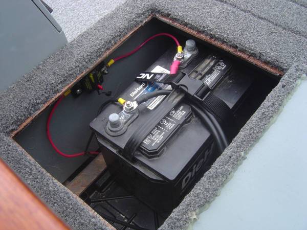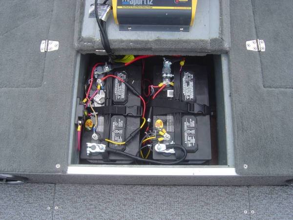 (2) 27- GROUP DEEP CYCLE BATTERIES WIRED FOR 12V UP FRONT AND A 50-AMP BREAKER FOR THE TROLLING MOTOR, A 24 GROUP DEEP CYCLE ENGINE BATTERY IN THE REAR WITH A 50-AMP BREAKER.