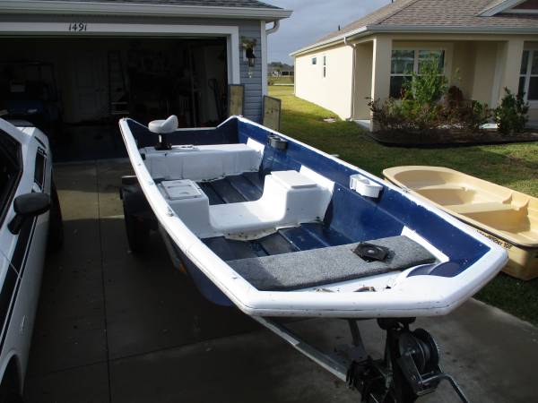 The boat is a Sears Gamefisher. My son built platforms to make the deck flat (easy to remove) and installed 2 fishing seats (the front seat is not installed but is super easy to install). The boat is very stable in the water because of its tri-hull design. Made out of fiberglass so no rust/oxidation. It also comes with a bimini top (easy to install but not shown in the pictures). The boat can handle up to a 25hp outboard but it is plenty fast, around 30 mph, with a 15hp. Weight capacity about 800lb.