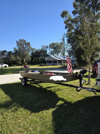 Excellent boat, ready to fish, comes with, gas motor, battery, Minn kota trolling motor, 3 life jackets, flare, fire extinguisher, whistle, floating device, anchor, ore, fishing net, poke stick, trailer, and a beautiful camo flat top for front deck (if desired) it can be taken on and off