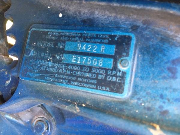 Vintage 1964 Evinrude Sportwin 9.5 hp short shaft. Model 9422R: twin cylinder, two-stroke engine with recall start and tiller handle. Not currently running - it's been stored for many years but ran well before then. I'm not a mechanic and so can't tell you the compression, etc.