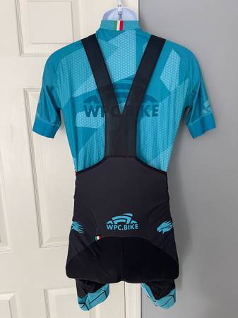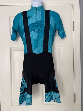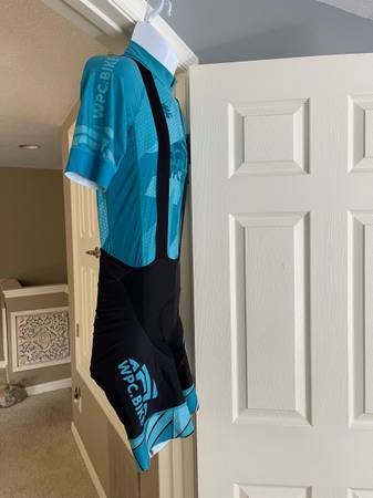 Size: Men’s Jersey Small and Bibshort XS Color: Light Blue Both Bibshort and Jersey included Local Bikeshop logo Winter Park, Fl Padding good No return