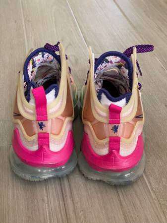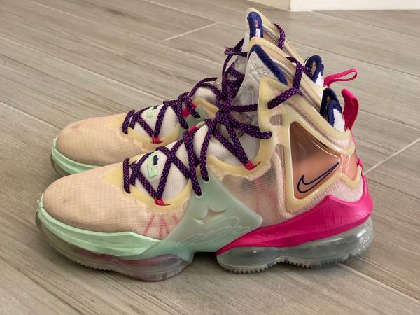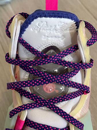 This collectible shoe injects LeBron James’ signature shoe with vibrant pops of color. A subtle pink tinge permeates the translucent woven upper, featuring fuchsia Flywire cables and mint green TPU wings integrated into the laces. Foam pods line the collar for enhanced ankle support, while a magenta-colored heel counter provides rearfoot stability. The sneaker is mounted on a hybrid setup that combines a 360-degree Max Air heel unit with responsive Zoom Air cushioning in the forefoot.