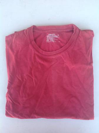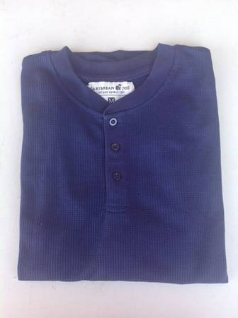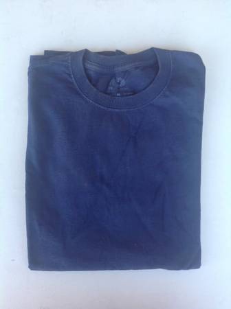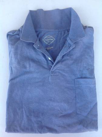 4 single color shirts, 1 with images 1 navy blue by Fruit of the Loom, L 1 blue polo by St. John's Bay, L 1 red by Hanes L 1 navy blue long sleeve button collar by Caribbean Joe Island Supply Co., M...