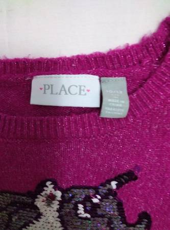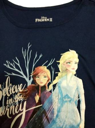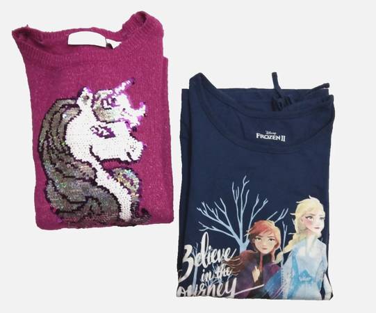 This product is a bundle: a Disney Frozen tee top, navy, and a pink unicorn sequin fluff sweater for girls aged 10-12. The tee features animated graphics of Anna and Elsa from Disney Frozen. The sweater is knit with glittery knit fashioned sequin unicorn accents. The sweater is a pullover with long sleeves and a crew neck.