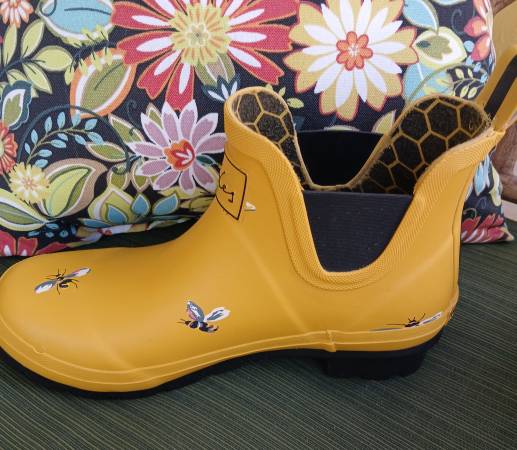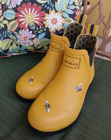 These Joules yellow bee ankle boots are a size 7 but they run large. I wear a size 8 wide and they fit me just fine, not too snug. They are yellow rubber boots with lovely bees on the outside and a honeycomb design on the inside. Nice features like pull on straps, side gussets and deep rubber treads. Excellent used condition, worn only once. The sole is 10 inches long and 3 1/2 inches wide on the bottom. Check out my other items for sale at this time. CASH ONLY, NO CASH APPS.