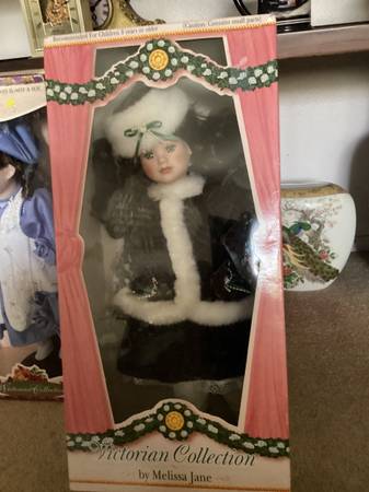 Three (3) Vintage 1998 Beautiful Victorian Genuine Porcelain Dolls by Melissa Jane in their Original Box for Sale for ONLY $50.00. The Boxes are a little worn for their age, but the Dolls are in Excellent Condition and have Doll Stands. If interested, please call show contact info