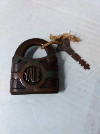 vintage Yale brass padlock with 1 key has rare square shackle YALE logo on 1 side, Y&T logo on the other side lock works approx 2"x2" square