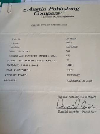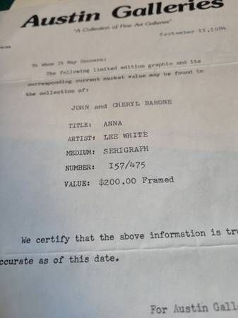 These are professionally framed. Came from Art Gallery. All the paper work is there. They are from 1984 and artist is Lee White. One is Serigraph and the other is silk screen. Artist died. Will...