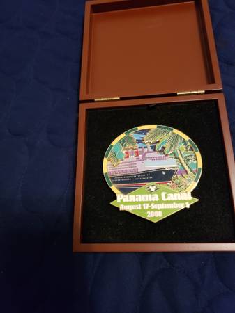 This is a commemorative pin depicting the first crossing of the Disney cruise ship going from west to east thru the Panama Canal