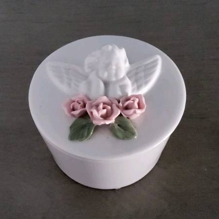 or Trinket Box with Lid features a charming design of cherubs and roses, perfect for any occasion. The small, round box is made of white porcelain with a glazed finish, adding a touch of elegance to any room. The lid keeps your trinkets safe