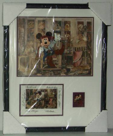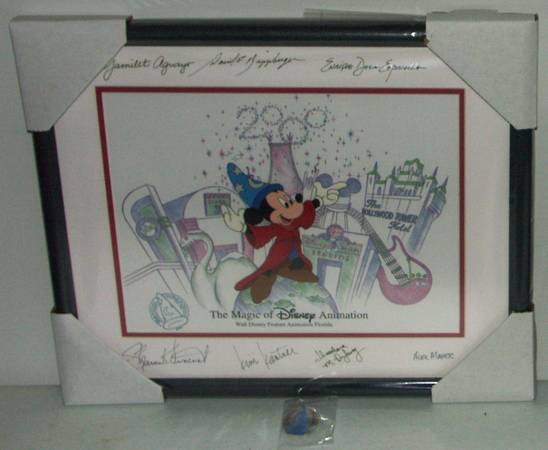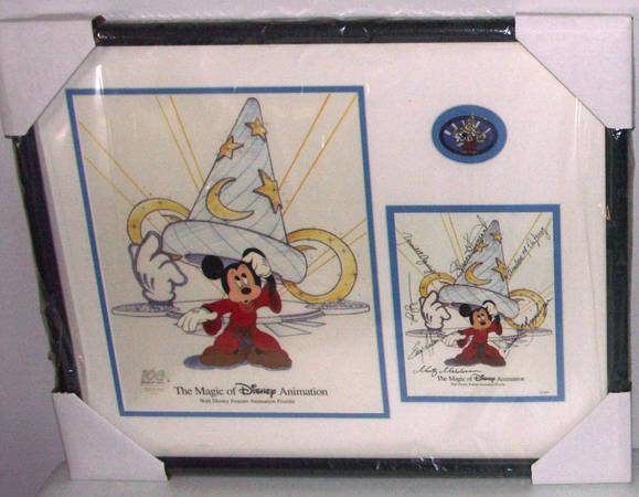 The single Walt Disney Studios, Original limited edition hand-painted cel featuring Mickey Mouse as Fantasia's 'Sorcerer's Apprentice' entitled 'Millennium Magic,' sold only in 1999–2000 in the Disney-MGM Studios theme park at Disney World, it has all the artists signature on the mat surrounding the cel, there were few of these done due to copying of artists signatures from the mat.